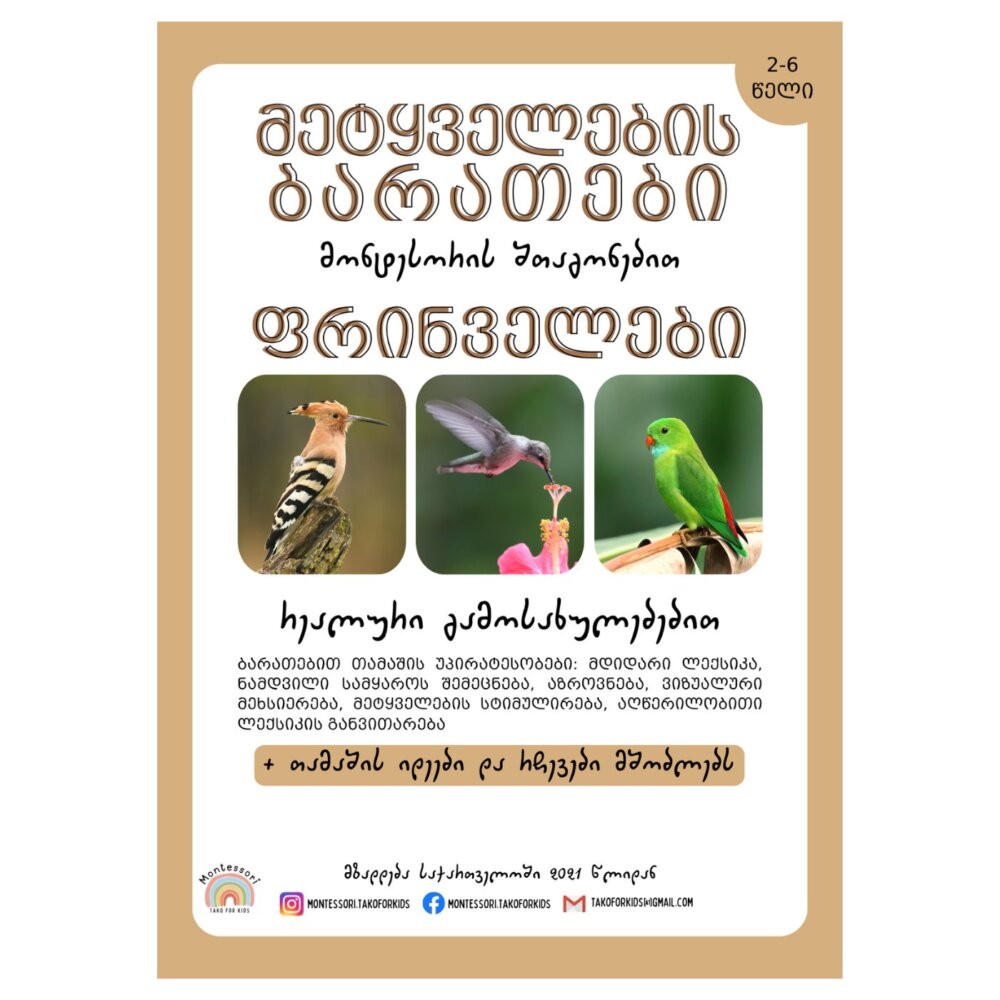 მარია მონტესორის პედაგოგიკის მიხედვით შედგენილი ეს რეალისტური ბარათები ფრინველების თემატური ბარათები დაგეხმარებათ ბავშვს ასწავლოთ ფრინველების ჯიშები მათი ნამდვილი სახით, როგორც ბუნებაშია. ესაუბრეთ ამ თემის ირგვლივ, წაახალისეთ ბავშვი, რომ თავადაც გიპასუხოთ, იაზროვნოს, დაიმახსოვროს და აღწეროს ფრინველები. ნაკრები გამოგადგებათ ზაფხულის გარე აქტივობების დროს – როგორც ბუნებაში, ისე ზოოპარკში. განმავითარებელი ბარათებით თამაშისას ხდება ლექსიკური მარაგის გამდიდრება კონკრეტული თემის ირგვლივ, ხდება აზროვნების, ლოგიკის და მეხსიერების განვითარება. აქტივობების იდეები ნაკრების თანდართულ სპეციალურ ინსტრუქციაში დაგხვდებათ;